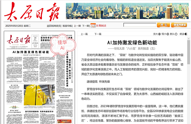 5?20丨《太原日報》頭版頭條報道佳華:AI加持 激發綠色新動能 在時代奔涌的浪潮之下,“雙碳”與數字化轉型宛如強勁的雙引擎,驅動著中國乃至全球經濟社會向著綠色、智能的新航道全速進發。當目光聚焦于能源大省山西,省會太原這座承載著厚重歷史與發展使命的城市,正積極投身于生態環境“雙碳”領域的數字化變革浪潮之... 了解更多